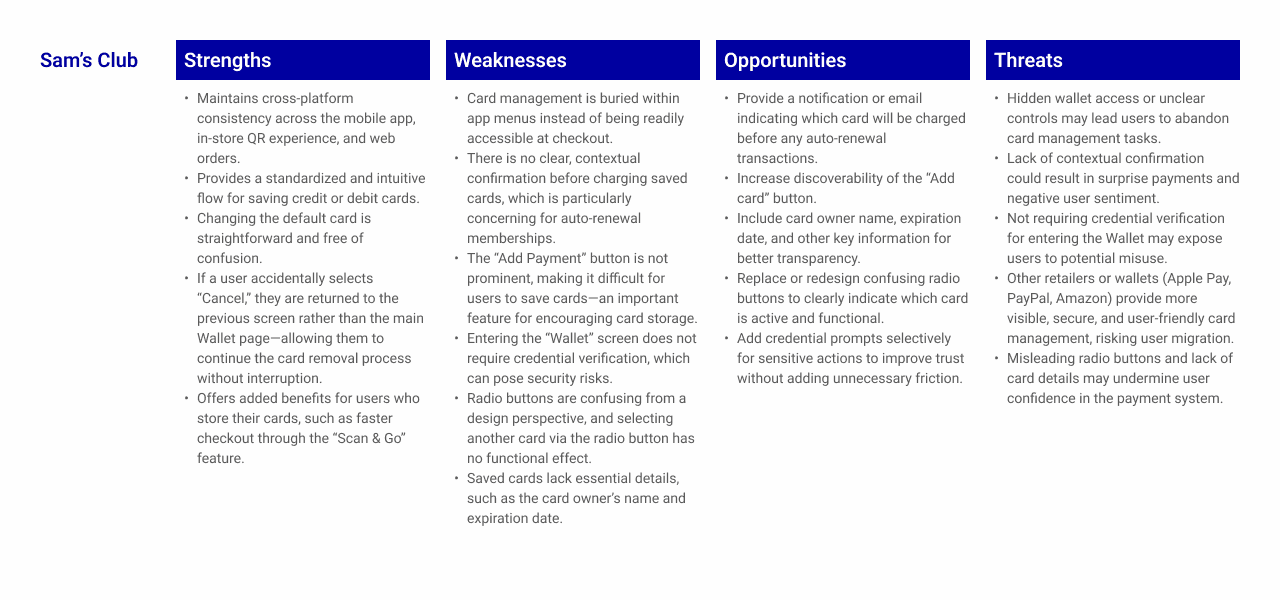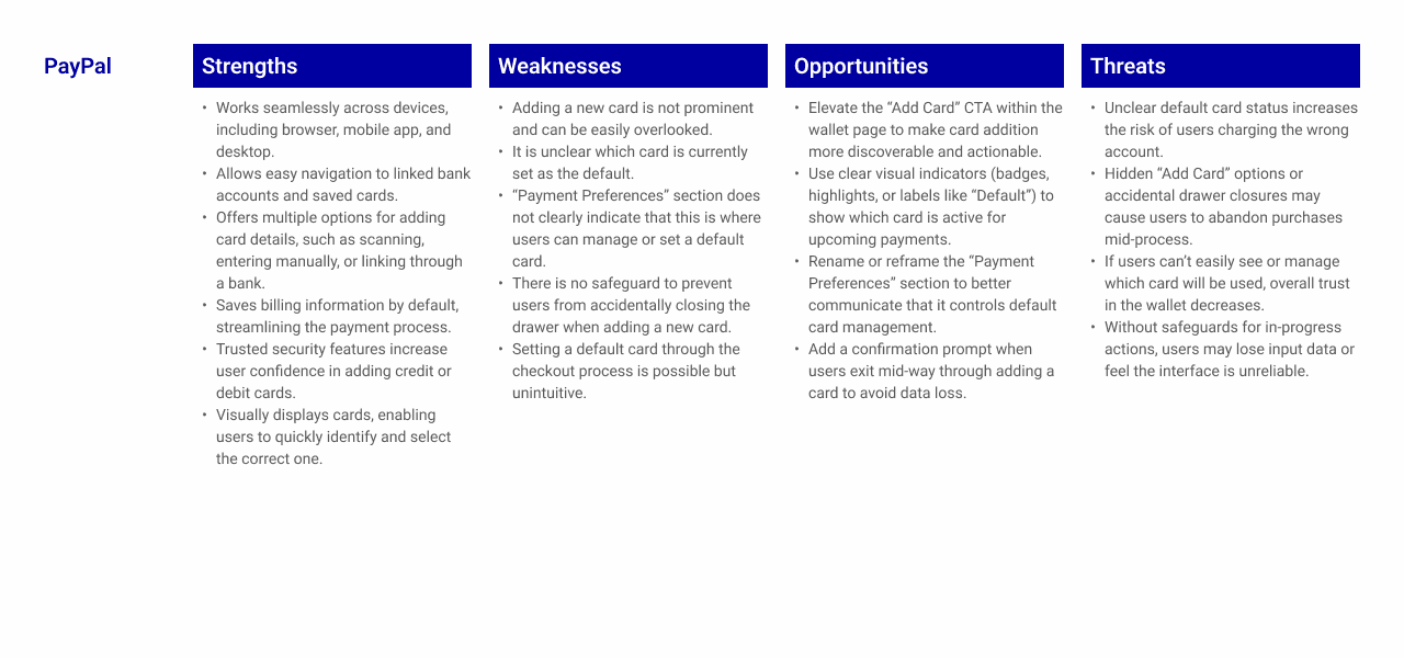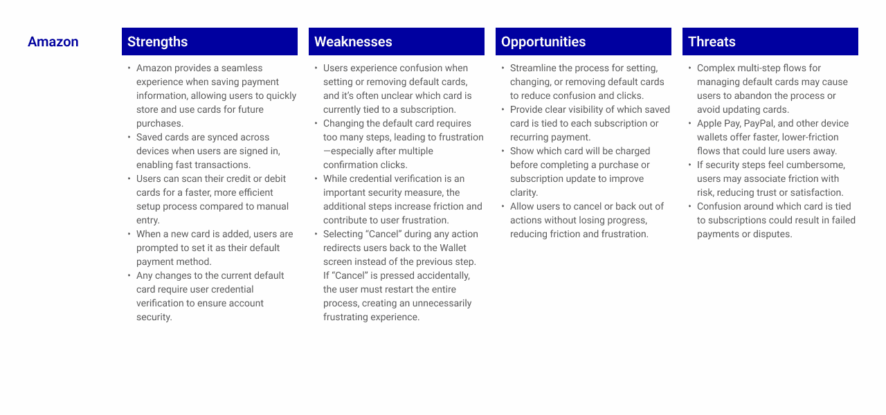 During my discussions with the Finance team, we collaboratively brainstormed while reviewing our workflows. We examined best practices from each competitor's workflow and cross-referenced them with our own use cases to identify opportunities for improvement in the Manage Wallet feature. These conversations helped highlight the strengths and weaknesses of each competitor.