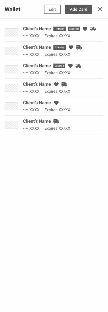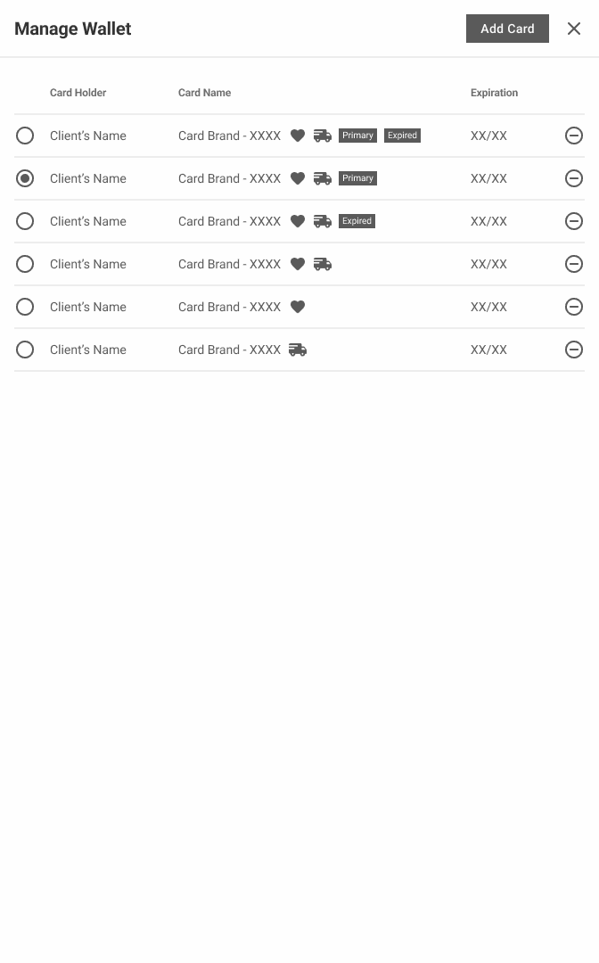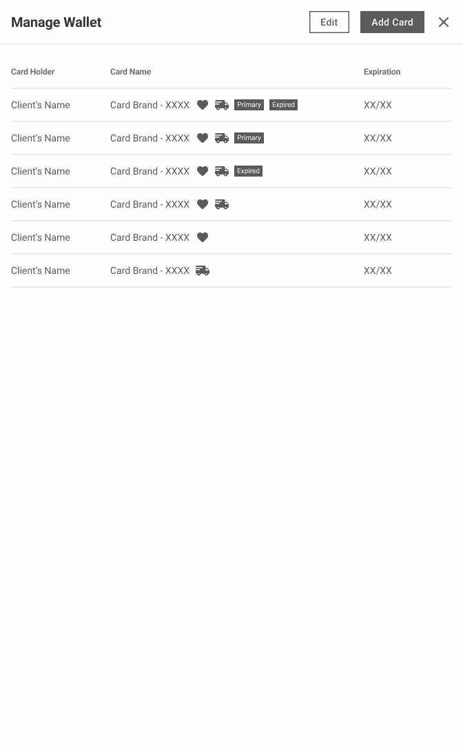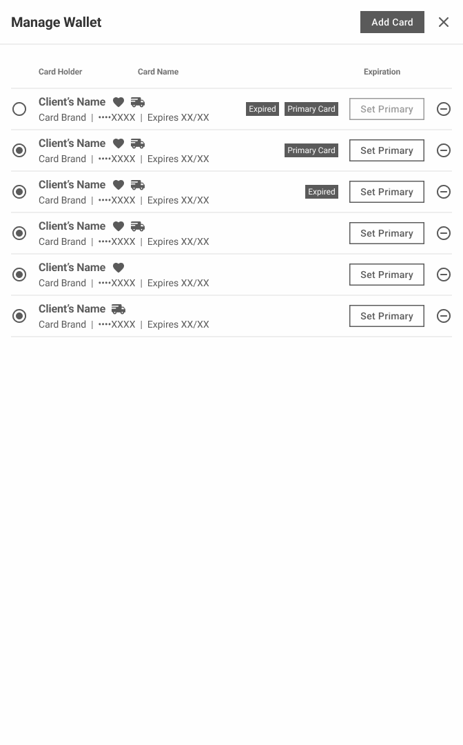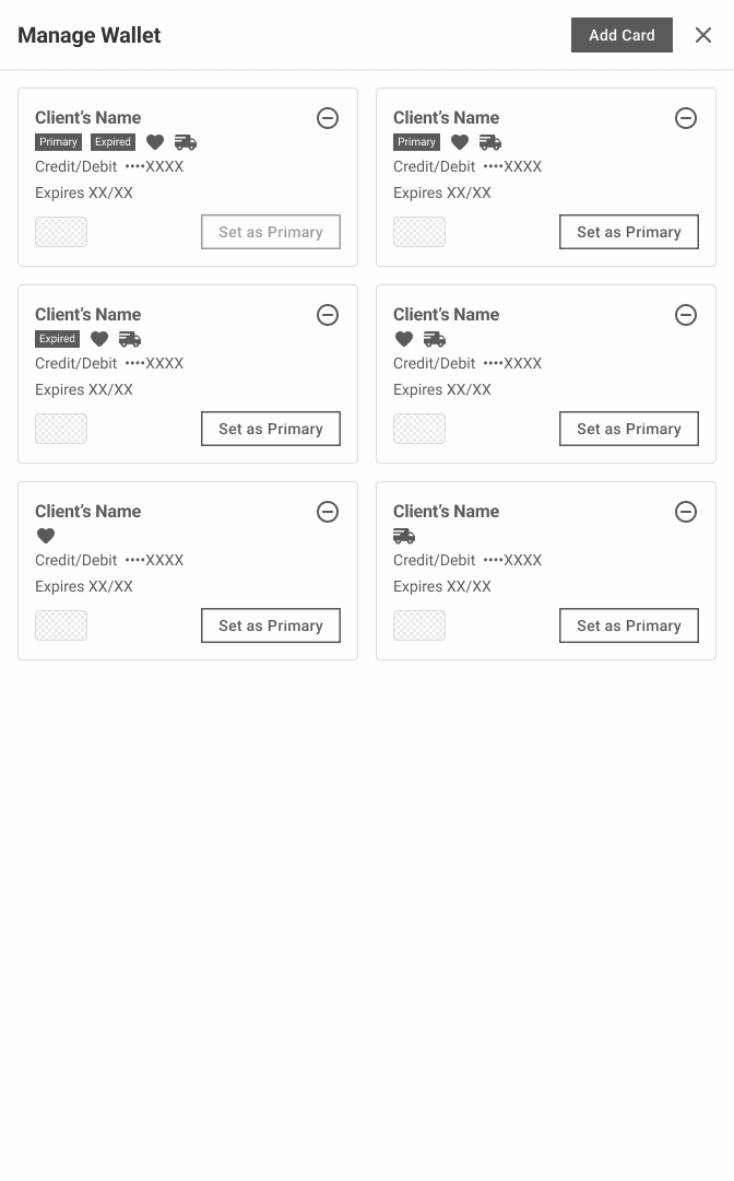 In addition to these priorities, it was also decided to iterate on the existing design, as the current Manage Wallet feature is outdated and does not align with our branding as it was created prior to the creation of the style guide.