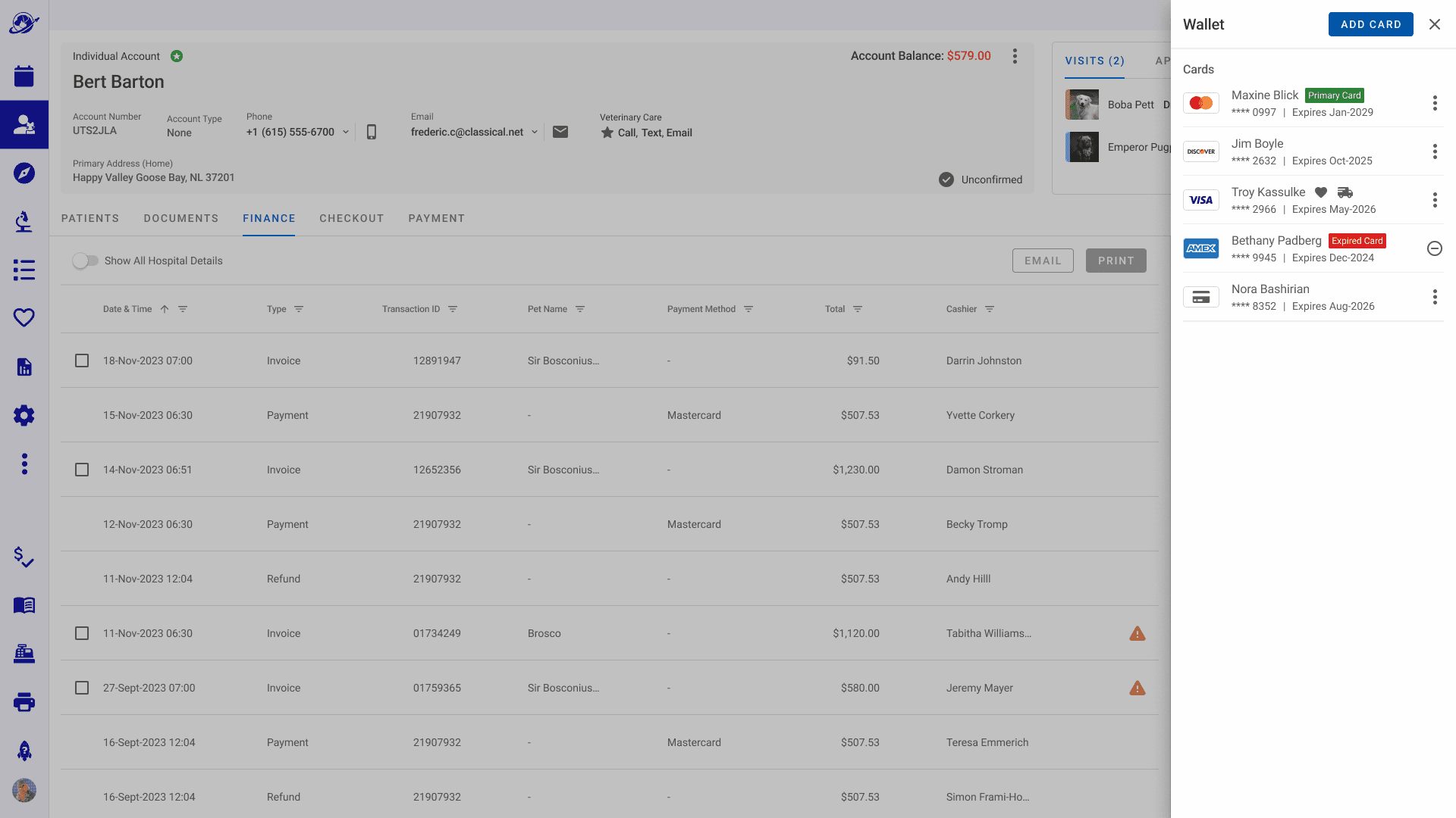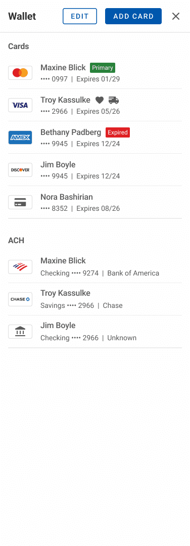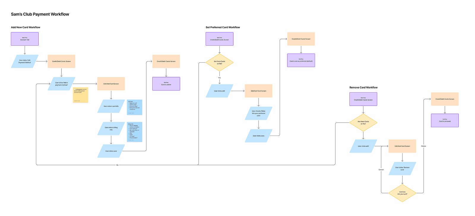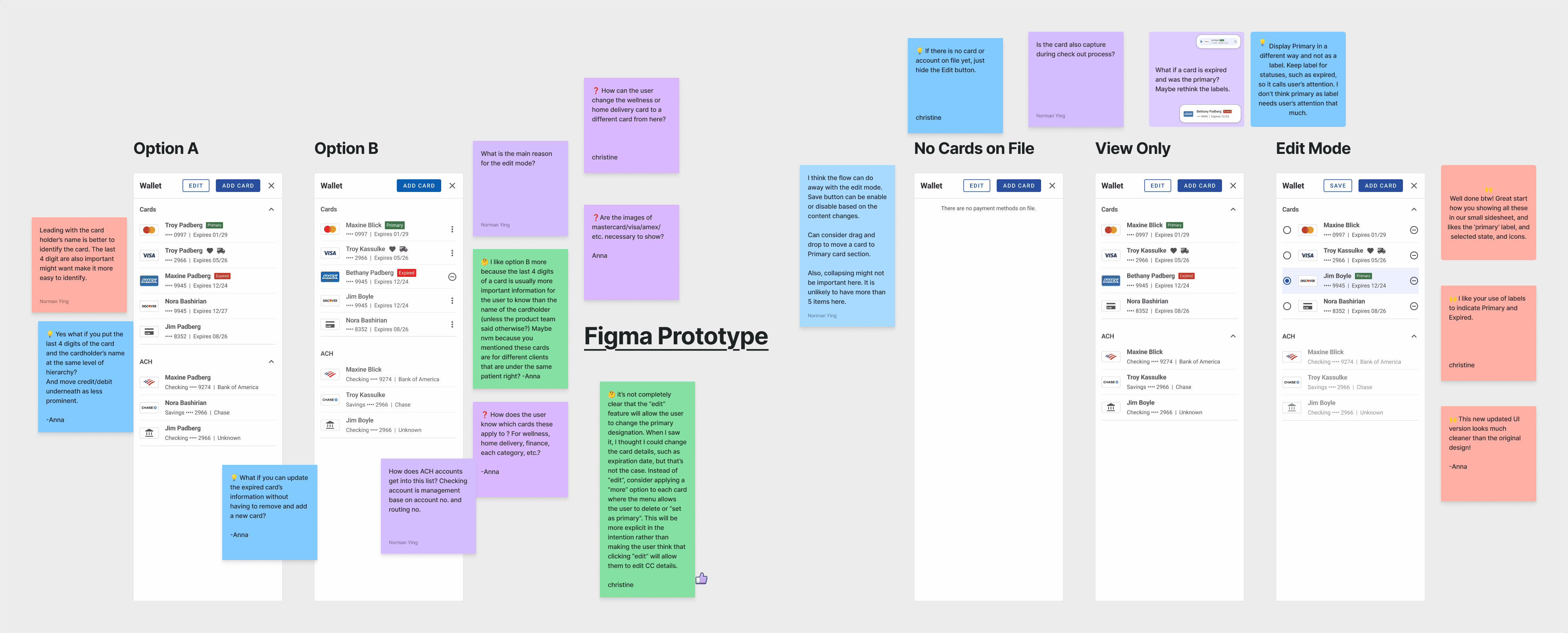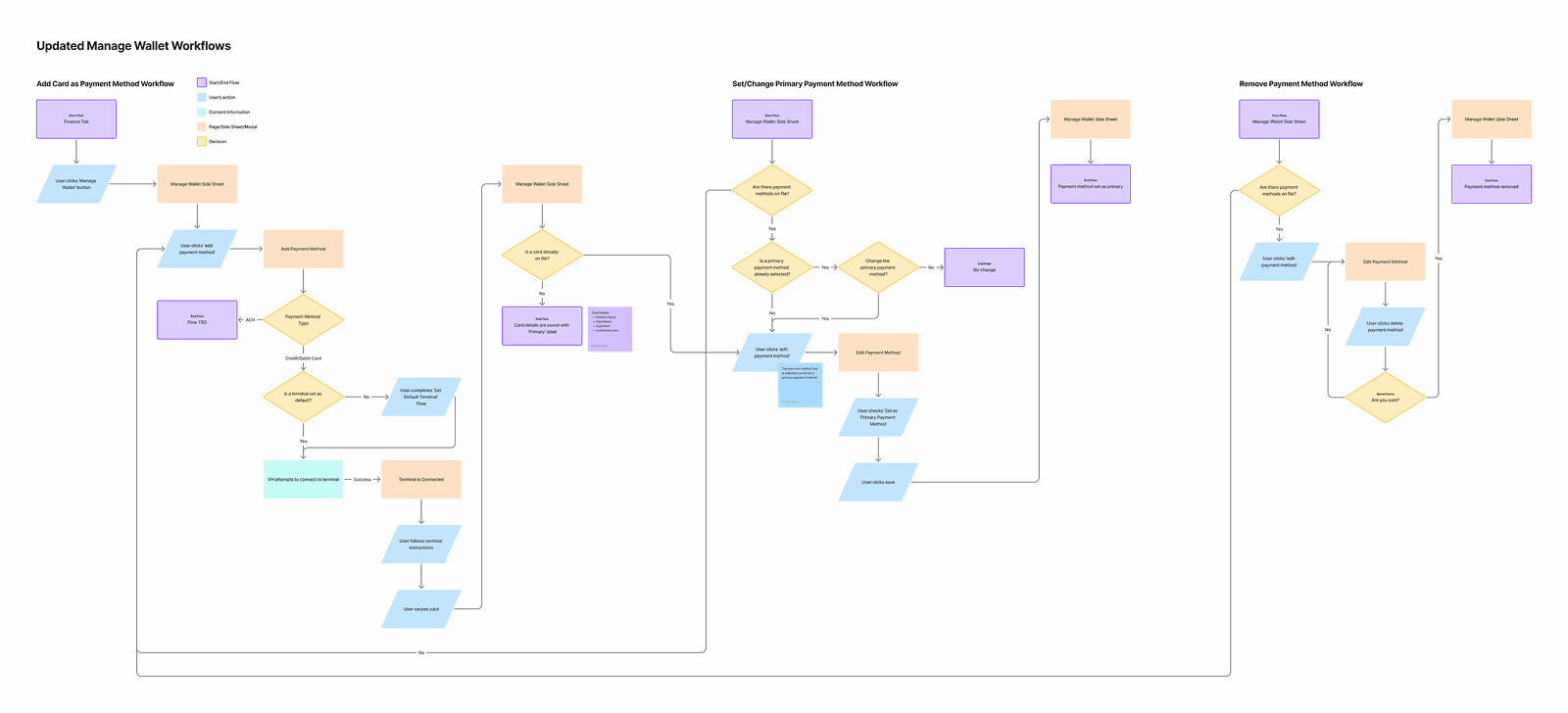 To kick off the project, the Finance team—consisting of a product owner, product manager, and myself—held discussions with several veterinary hospitals to better understand their current pain points. Through these conversations, we uncovered multiple use cases, with the primary frustration being confusion around identifying which credit or debit card was set as the default and the inability to remove a defaulted card. This limitation posed a significant issue, as it often disrupted daily workflows and prevented staff from completing essential job duties—particularly problematic in a fast-paced environment like a veterinary hospital, where efficiency is critical.