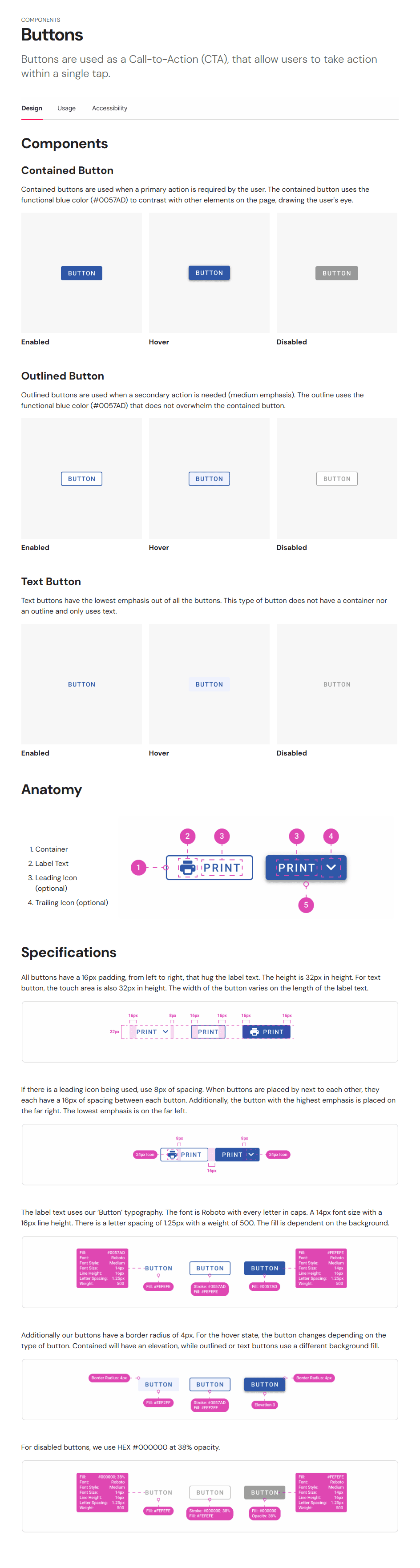 Documented design components with detailed specifications for developers, designers, stakeholders, etc.