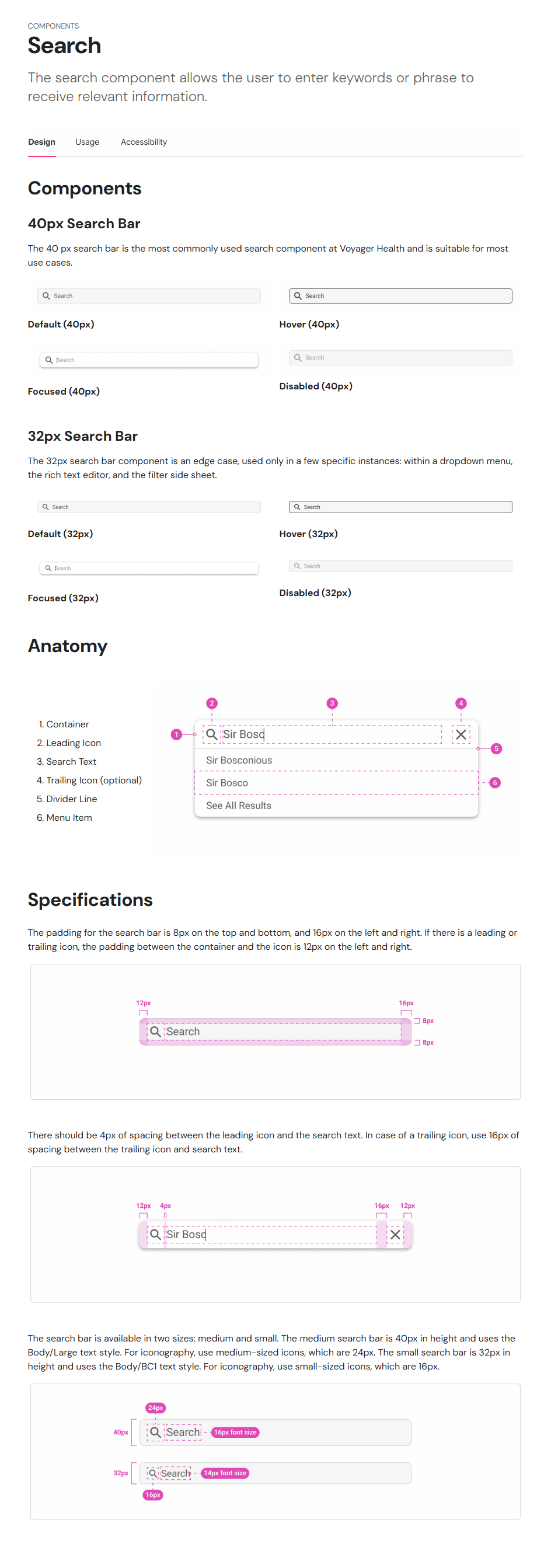 Documenting the design library was no easy task, but with the support of other designers, we created fully detailed documentation for each component. This not only outlined how components should function but also provided developers with precise specifications on how they should be built. While we used Google’s Material 3 documentation as a reference point, we adapted and refined it to align with MVH’s standards.